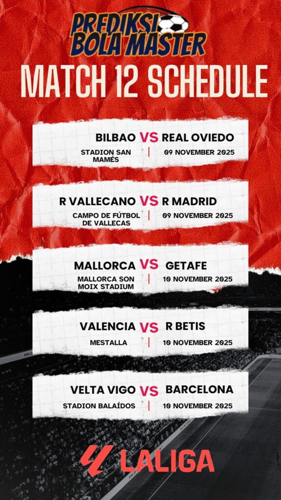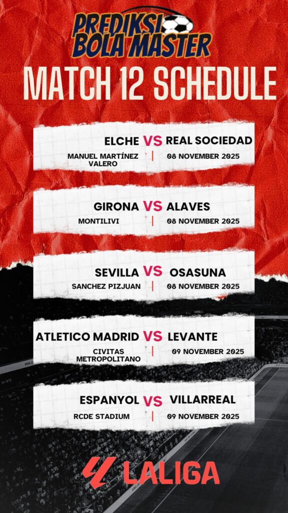 Memasuki pekan ke-12 La Liga musim 2025/2026, tensi kompetisi semakin panas. Sejumlah pertandingan penting akan tersaji pada tanggal 8–10 November 2025, di mana klub-klub papan atas berupaya mengamankan posisi menjelang paruh musim. Berdasarkan jadwal resmi, matchday ini menawarkan beberapa duel menarik yang berpotensi menghadirkan kejutan.