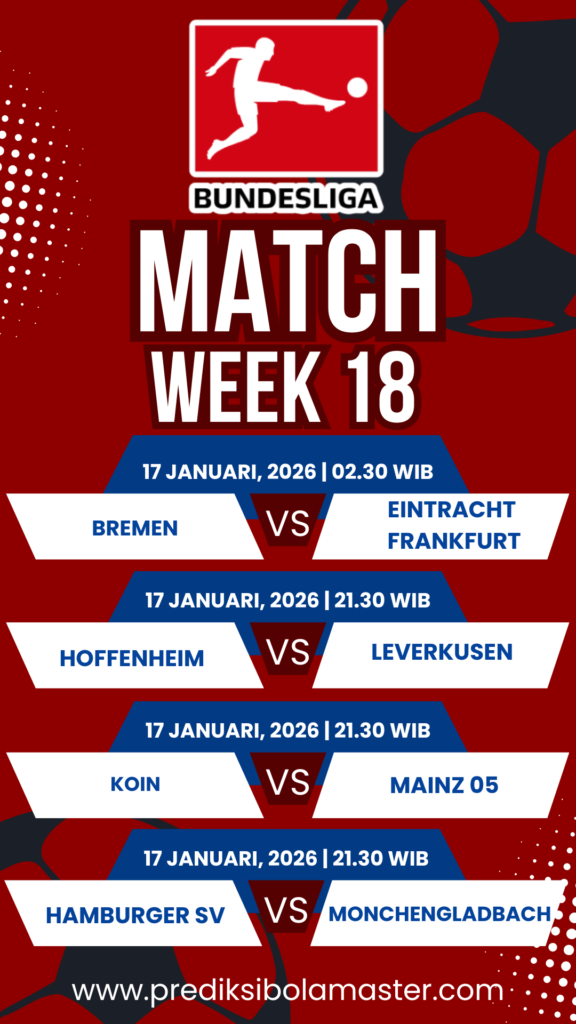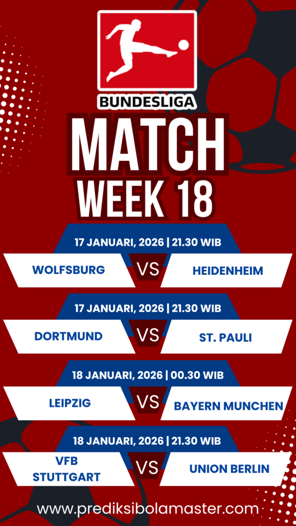 Melalui artikel ini, prediksibolamaster menyajikan jadwal lengkap pertandingan Bundesliga pekan ke-18 yang akan berlangsung pada 17–18 Januari 2026, lengkap dengan gambaran singkat setiap laga agar mudah di pahami oleh pembaca WordPress maupun penggemar sepak bola.