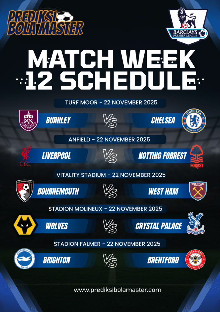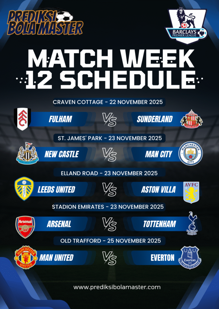 Liga Inggris kembali memasuki pekan ke-12, dan atmosfer persaingan semakin memanas. Setiap tim mulai menunjukkan identitas permainan yang lebih jelas, sementara klub-klub papan bawah berusaha keluar dari tekanan. Pada pekan ini, banyak pertandingan besar akan tersaji berdasarkan jadwal dari gambar yang tersedia, dan semuanya memberikan cerita menarik untuk dibahas. Melalui ulasan lengkap ini, prediksibolamaster menghadirkan analisis menyeluruh yang dapat menjadi referensi bagi para penggemar sepak bola. Artikel ini mengulas jadwal pertandingan, potensi hasil, dan dinamika yang terjadi di setiap laga.