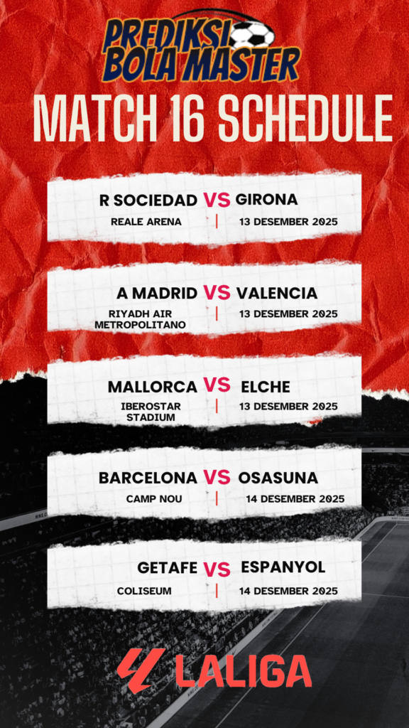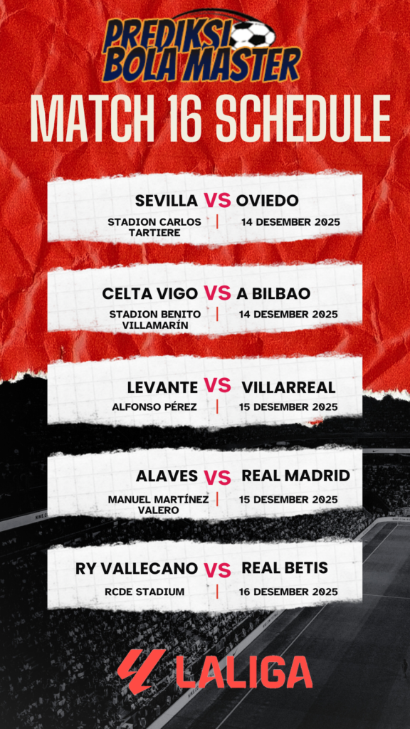 Pekan Ke-16 La Liga (13-16 Desember 2025) menjanjikan empat hari penuh aksi dan kejutan. Dari derby Valencia yang sarat gengsi hingga laga wajib menang Barcelona dan ujian berat Real Madrid, setiap pertandingan memiliki makna krusial dalam peta persaingan La Liga musim ini.