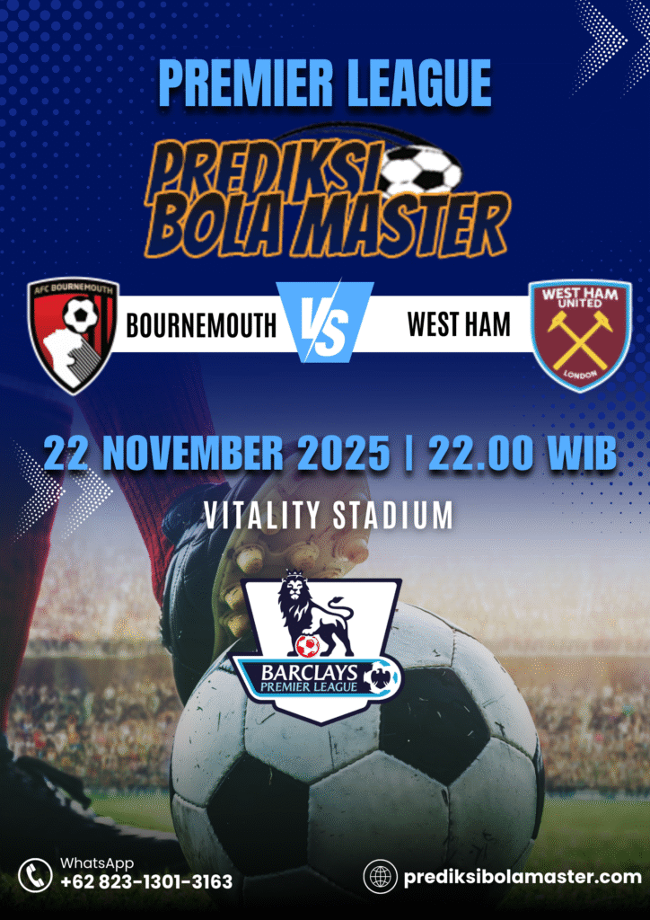 Pertandingan Bournemouth vs West Ham pada 22 November 2025 kemumgkinan akan menjadi laga sengit dengan tekanan tinggi dari tuan rumah. Bournemouth di untungkan oleh motivasi dan performa menyerang, sementara West Ham akan berusaha memanfaatkan serangan balik dan momen transisi. Prediksibolamaster memproyeksikan kemenangan tipis 2–1 untuk Bournemouth, dengan kemungkinan gol dari kedua tim. Untuk taruhan, kombinasi “Bournemouth menang”, “Over 2.5”, dan “BTTS Ya” adalah pilihan yang rasional dan optimal berdasarkan analisis.