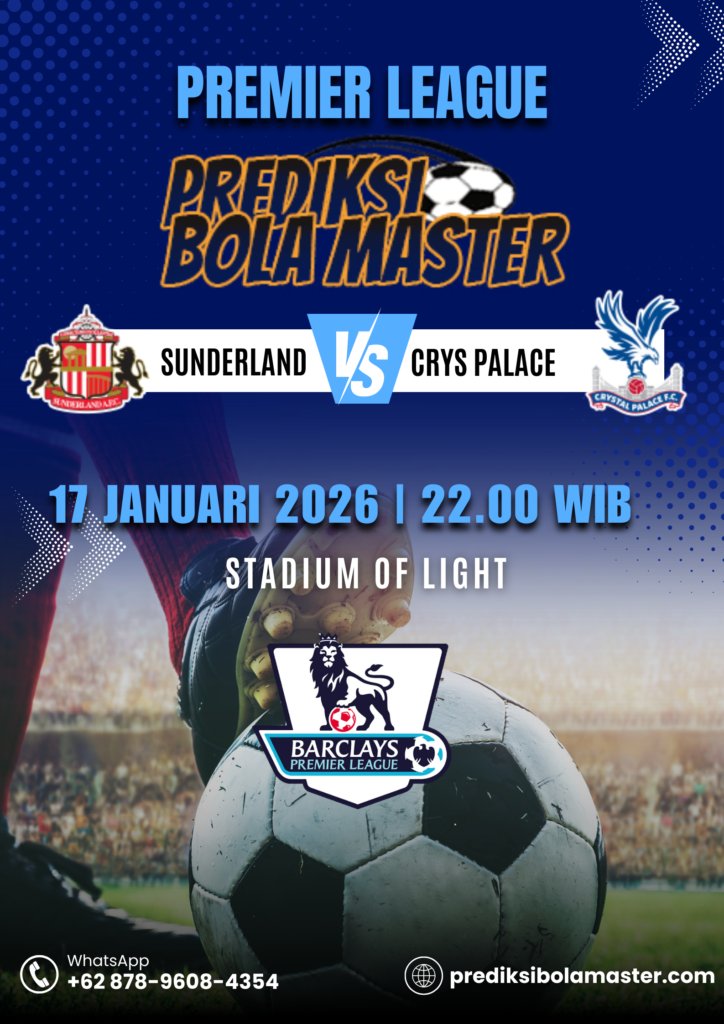Pertandingan menarik Liga Inggris akan tersaji pada 17 Januari 2026 saat Sunderland menjamu Crystal Palace. Kedua tim kemungkinan tampil ngotot demi meraih poin penting, terutama dalam persaingan posisi papan tengah klasemen. Dalam artikel ini, prediksibolamaster akan mengulas kondisi tim, rekor pertemuan, analisis taktik, hingga prediksi skor dan tips taruhan terbaik.